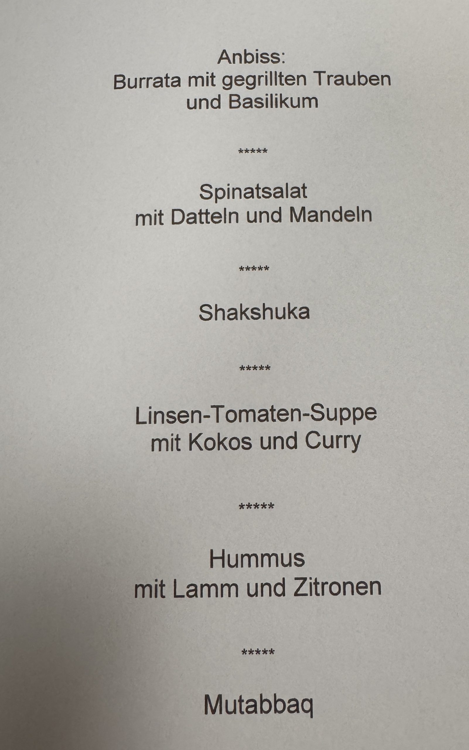 Nach dem Apero konnten wir dann mit folgendem Menü starten.