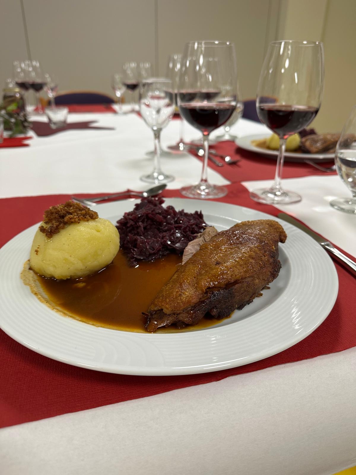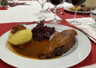 Jetzt ging es wieder „ab in die Küche“!! Die Gänsebrust mit Rotkohl und Kartoffelknödel wurden final fertig zubereitet und portioniert und……serviert.