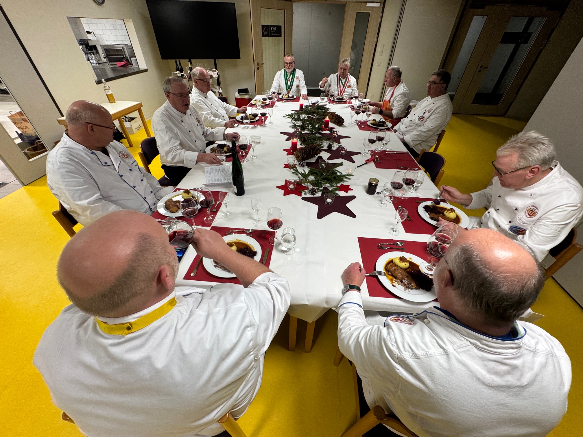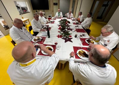 Der bislang aktive Vorstand wurde einstimmig, mit den üblichen Enthaltungen, wiedergewählt und die (vorläufigen) Termine für 2026 ausgearbeitet. Danach konnte es ans „Kochen“ gehen, wobei die Kochbrüder: Peter „Gänsebrüste“, Harald „Rotkohl“ Frank „Kartoffelknödel“ und Lars „Lebkuchenparfait“ vorbereitet hatten. Diese Menükomponenten wurden dann von allen Kochbrüdern fertig zubereitet und eine schöne Tafel gedeckt.