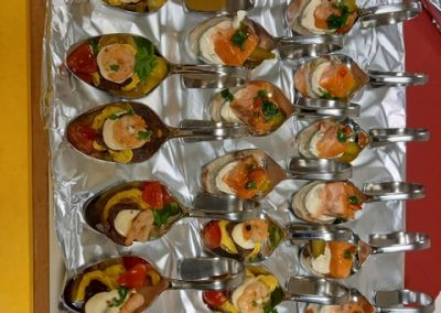 Spinat-Frischkäse-Lachs-Rolle; Canapés mit Baba Ganoush und Oliventapernate und Canapè mit Kalbfleisch (wahlweise mit Kreen oder mit Vitello-Tonato).